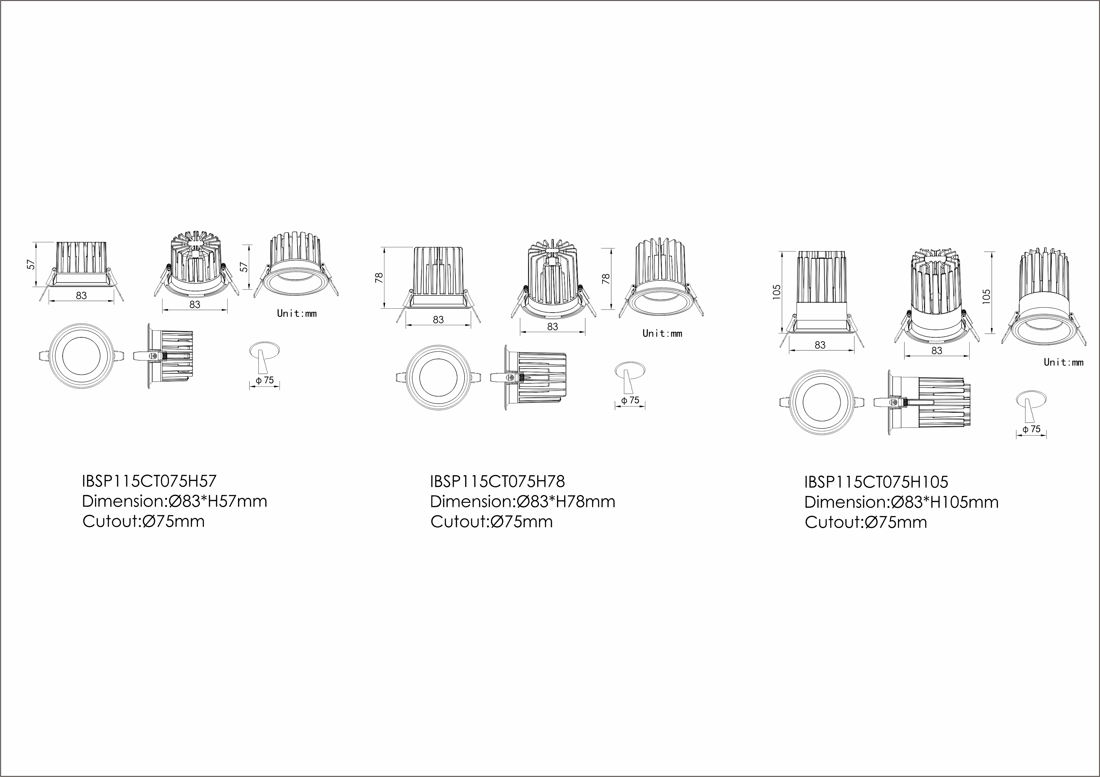 | IBSP115CT075H78 | 15W | Ø83mm×H78mm | Ø75mm | Reflector 15°| 24°|38°|45°|60° Lens15°| 24°|38° Fixed |